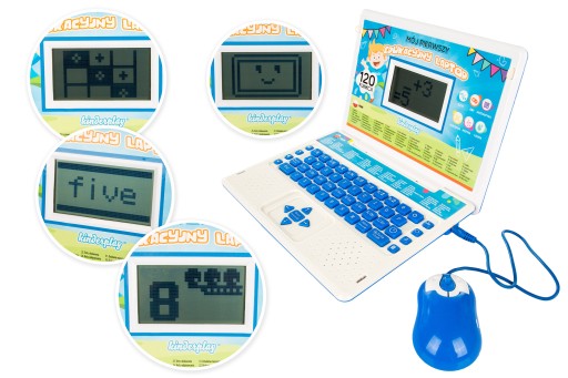 - Edukacyjny laptop posiada łącznie 120 funkcji, w tym: wybór języka (polski, angielski), zadania matematyczne, muzykę, ćwiczenia pamięciowe, gry i zegar.