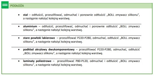 UWAGA: Szpachlówki nie należy stosować bezpośrednio na podkłady reaktywne oraz jednokomponentowe środki akrylowe i nitrocelulozowe.