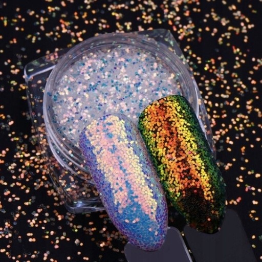 Na paznokciach daje efekt iskrzących drobinek mieniących się wieloma kolorami!