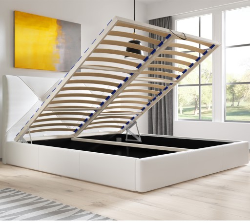 - Łóżko wyposażone jest w duży pojemnik na pościel - solidna drewniana konstrukcja, podnośniki sprężynowe