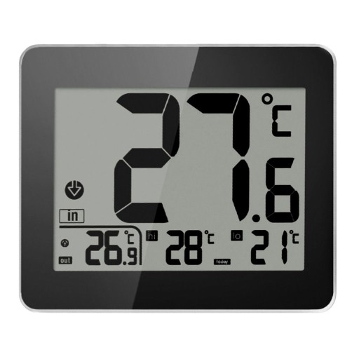 Termometr o eleganckim wzornictwie z bardzo dużym i czytelnym ekranem, pokazującym temperaturę wewnętrzną i zewnętrzną, wartości minimalne i maksymalne oraz godzinę. Czujnik z przewodem 145 cm. Zasilany baterią CR2025 (w zestawie).