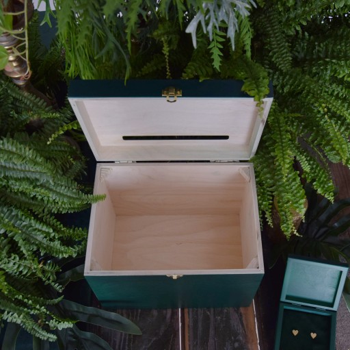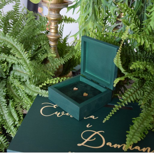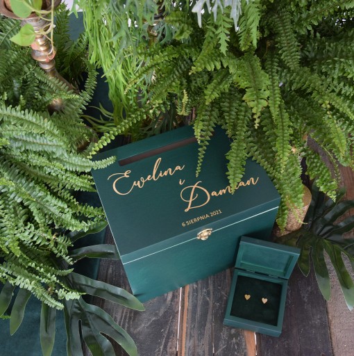 Na naszej aukcji oferujemy piękny ZESTAW W KOLORZE BUTELKOWEJ ZIELENI :pudełko na obrączki oraz pudełko na koperty.