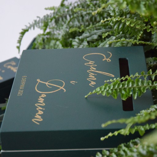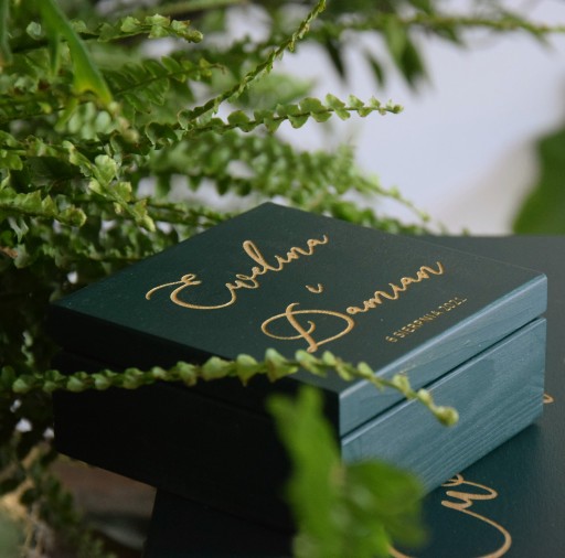 Oba przedmioty zachowany w eleganckim stylu. Na pudełkach możesz swoje imiona oraz datę.