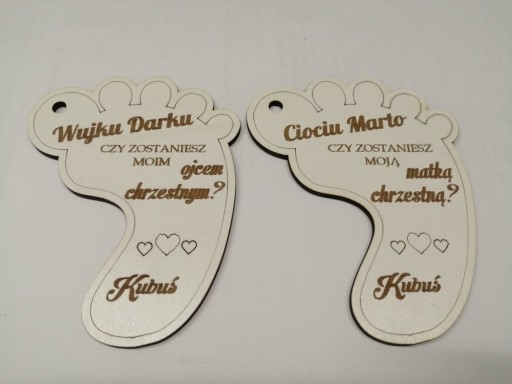Przedmiotem aukcji jest magnes prośba o zostanie matką chrzestną, ojcem chrzestnym. Wykonany z białej płyty meblowej lub sklejki brzozowej o grubości 3 mm.