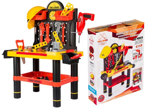 Stół warsztatowy z narzędziami to zestaw, który z pewnością zadowoli każdego małego majsterkowicza! W zestawie z warsztatem dzieci znajdą wiele akcesoriów (śrubki, nakrętki, wkrętaki itp..). Po włożeniu baterii do wiertarki i naciśnięciu przycisku wiertło kręci się jak w prawdziwej wiertarce! Zabawka zajmuje niewiele miejsca i jest łatwa w montażu / demontażu (przejrzysta instrukcja obsługi)