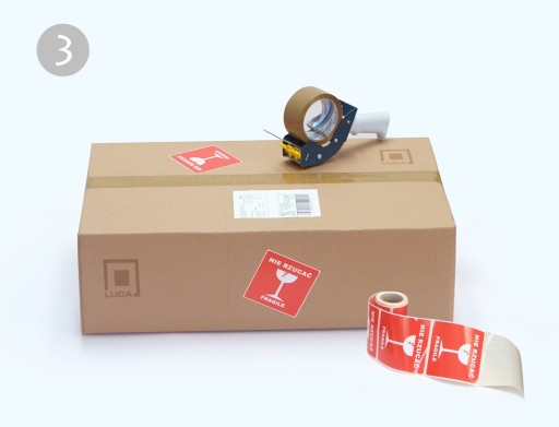 Paczkę zaklejamy mocną taśmą pakową i oznaczamy informacjami z etykietami ostrożnie szkło. Tylko tak rygorystyczne podejście daje nam pewność że nasze zamówienia dojadą do Klientów w nienaruszonym stanie, bez żadnej szkody i na czas.