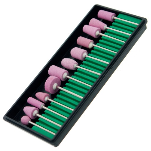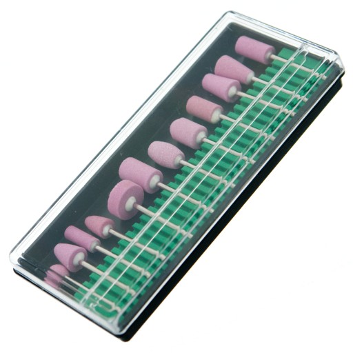 - 12 FREZÓW PIASKOWYCH-KAMIENNYCH– zestaw wykonany z obrobionego kamienia, a dokładniej tlenku glinu, o średniej ziarnistości. Frezy mogą być wykorzystywane zarówno na sucho, jak i na mokro. Doskonale sprawdzają się do obróbki manicure, pedicure oraz w podologii; komplet jest wielokrotnego użytku;