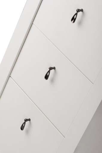 - Zestaw stylizowanych mebli został wykonany w całość z naturalnego drewna, które zostało polakierowane na biały kolor z delikatnie prześwitującą strukturą drewna.