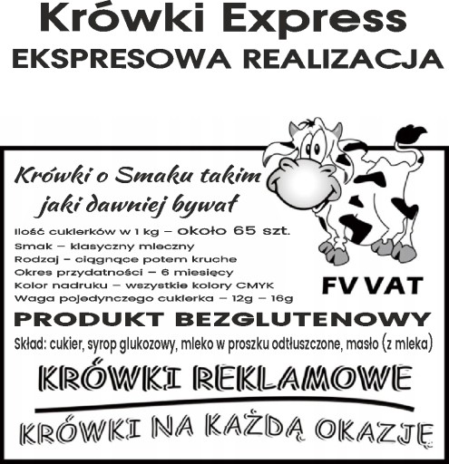oferujemy Państwu 2 KG przepysznych KRÓWEK REKLAMOWYCH z dowolnym nadrukiem wyprodukowanych specjalnie pod Państwa zamówienie w trybie EXPRESS z gwarantowanym terminem wysłania zamówienia w NASTĘPNYM DNIU ROBOCZYM liczonym od momentu dostarczenia lub akceptacji projektu etykiety cukierka.