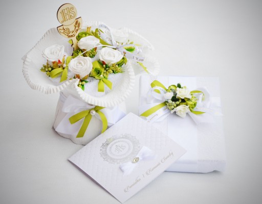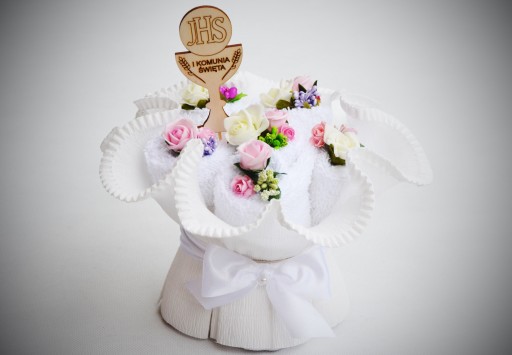 wykonany jest z grubych i puszystych ręczników w kolorze białym - 3x30x50cm. Dekoracja wykonana jest z najwyższej jakości dodatkówflorystycznych w następującej kolorystyce do wyboru: biało-zielona, biało-różowa, biało-błękitna. Dopełnienie bukietu stanowią drewniane dodatki w postaci hostii z grafiką.