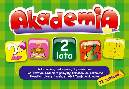 Książeczka Akademia 2 lata została przygotowana dla najmłodszych dzieci, które dopiero zaczynają się uczyć, jak trzymać kredkę, rozpoznawać kształty, wzory, kolorować. Zadanka są idealnie dostosowane do wieku dziecka, sprawiając, że będzie się szybko rozwijało. Łączenie par, rozpoznawanie wzorów, kształtów, prowadzenie linii wszystko to rozwija spostrzegawczość, umiejętności manualne, rozbudza ciekawość. Pod każdym zadaniem jest temat dla rodzica do rozmowy z dzieckiem, propozycja zabawy. Dzięki temu Akademia 2 lata jest idealna dla każdego dwulatka. Dodatkowym atutem są kolorowe naklejki i bardzo poręczny format książeczki. Serdecznie polecamy!