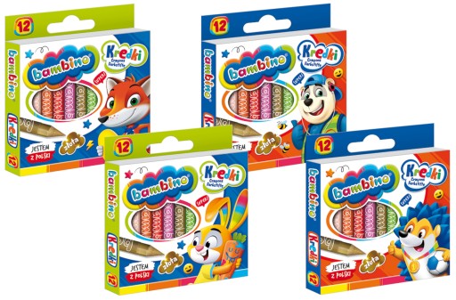- każda kredka posiada papierową ochronną owijkę z indywidualnym motywem graficznym ułatwiającym naukę i rozpoznawanie kolorów (na każdej kredce inne zwierzątko)