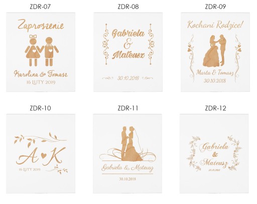 Podeślij informacje takie jak: numer wzoru znajdujący się przy wybranym przez Ciebie projekcie oraz informacje potrzebne do spersonalizowania danego wzoru (imiona państwa młodych, data ślubu, dedykacja - kto życzy - możesz podać całą własną dedykację lub tylko imiona osób wręczających, wtedy treść dedykacji pozostanie taka jak na wzorze, podmienione zostaną tylko imiona). Jeśli nie życzysz sobie żadnej dedykacji na skrzynce - napisz o tym w informacji do sprzedającego.