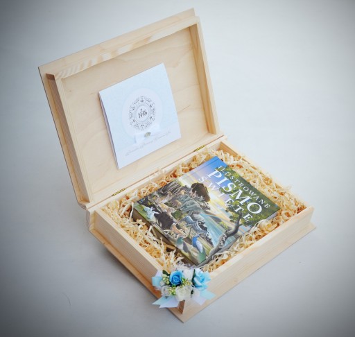 - elegancką, dużą, drewnianą szkatułkę w kształcie książki z indywidualną, ręcznie wykonaną dekoracją; wymiar szkatułki 35x25x12 cm