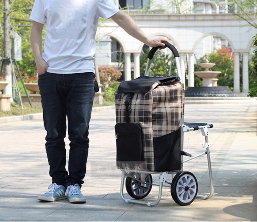 SitGo wózek na zakupy na dwóch łożyskowanych kołach jest wykonany z aluminium dlatego jest idealny aby aby iść z tobą na zakupy. Wózek wyposażony jest w rozkładane krzesełko dlatego świetnie nadaje się dla osób starszych, wędkarzy lub pielgrzymów. Rama wózka zrobiona jest z grubych aluminiowych profili dlatego jego konstrukcja jest bardzo wytrzymała i lekka. Torba jest wodoszczelna i można ja zdejmować do prania . Posiada dwie kieszonki zamykane na suwak i dwie kieszenie z boku w którym można przechowywać np. butelkę wody lub parasolkę. Główna komora zamyka się za pomocą ściąganego sznurka oraz klapy . Jeżeli masz wystarczającą ilość pieniędzy na zakupy możesz załadowań na niego aż 30 kg towaru, a torba pomieści aż 50 L.