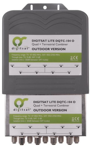 Sumator sygnału satelitarnego i telewizji naziemnej DVB-T DigitSat DQTC-104 O. Urządzenie pozwala zsumować sygnały z konwertera satelitarnego quad i anten naziemnych. Sumuje częstotliwości 950-2150 MHz (satelitarna) z częstotliwościami 47-862 MHz (radiowa i TV naziemna).