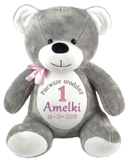 Mamy przyjemność przedstawić Państwu przepięknego pluszowego misia w kolorze szaro-białym z wyhaftowanym tekstem z okazji urodzin dziecka oraz cyferką.