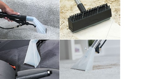 Sprawdzi się w najtrudniejszych warunkach; posiada akcesoria do prania dywanów, wykładzin oraz tapicerek meblowych i samochodowych, odkurzania na sucho oraz zbierania wody.