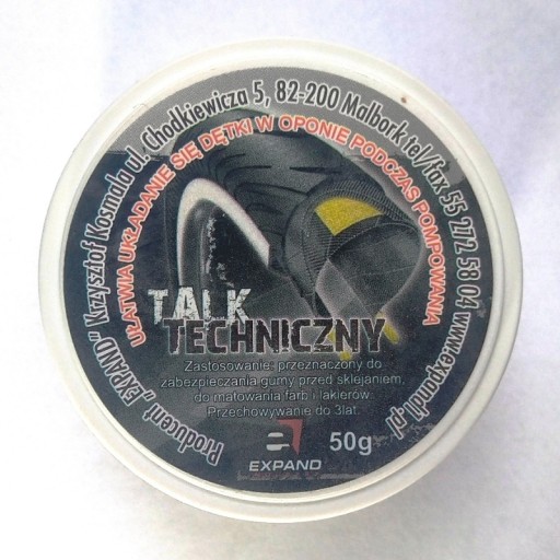 Talk Techniczny - Ułatwia bezpieczne układanie się dętki w oponie w czasie pompowania. Powszechnie używany do zapobiegania łączenia się gum np. dętki do opony. Znajduje zastosowanie przy matowaniu farb i lakierów. Konserwuje przechowywane produkty zawierające lateksowe jak i gumowe elementy uszczelniające.
