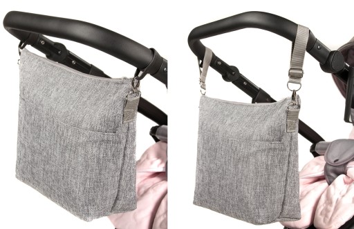 Organizer posiada regulowany pasek i nowoczesne dwa systemy zapinania na rączce wózka, za pomocą karabińczyków i uniwersalnych zaczepów (paseczków, które są w zestawie)
