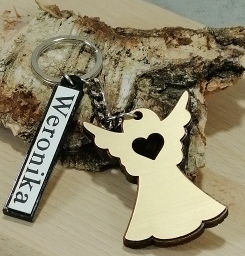 Aniołek wykonany z bejcowanej sklejki 4mm i zabezpieczonej lakierem akrylowym, na którym został przyklejony obustronnie złoty laminat.