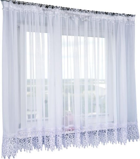 Oferujemy państwu firanę z białego woalu wykończoną gipiurą oraz lamówką, gotową do zawieszenia.