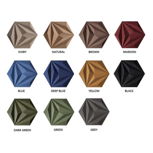 Trójwymiarowy panel ścienny dostępny jest w 11 kolorach: ivory, natural, brown, yellow, green, dark green, deep blue, blue, maroon, black i grey. Na tej aukcji sprzedajemy wszystkie pokazane poniżej kolory bez koloru natural - który dostępny jest na innej naszej aukcji.