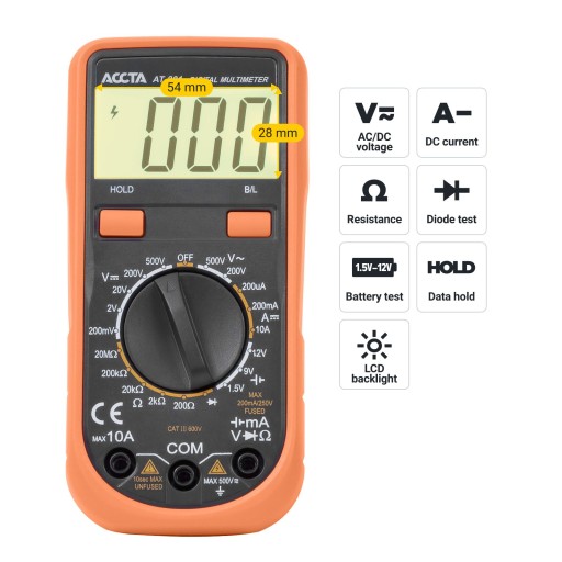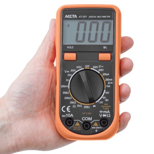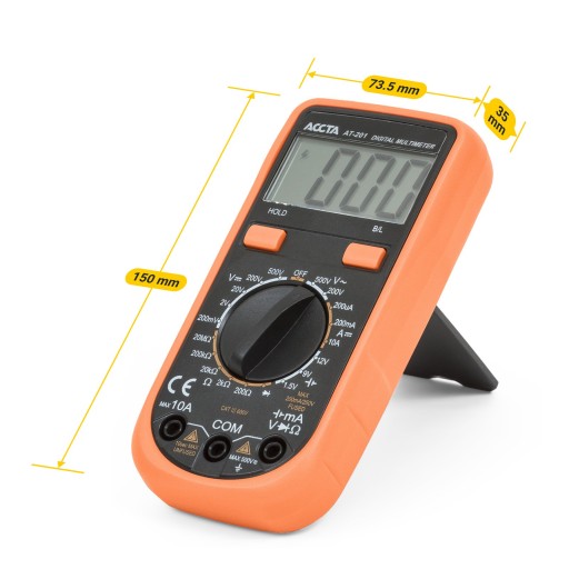 Accta AT-201 to kompaktowy multimetr cyfrowy przeznaczony do pomiaru prądu stałego i przemiennego, prądu stałego i rezystancji, a także do testowania diod i akumulatorów. Wyposażony w duży 1999-bitowy wyświetlacz LCD. Urządzenie jest niezawodne i bezpieczne w użyciu.