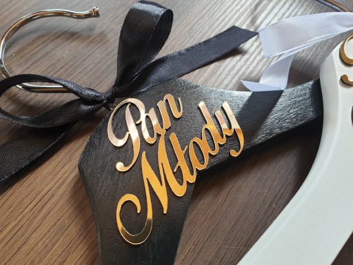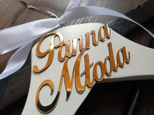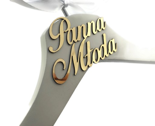 Najbardziej charakterystycznym elementem wieszaka jest napis wykonany ze złotej lustrzanej plexi umieszczony na górnej części. Ten szczegółowy i precyzyjnie wykonany napis dodaje wieszakowi unikalnego uroku, przyciągając uwagę i podkreślając jego elegancję. Dzięki tym wieszakom można w prosty sposób wyeksponować swoje ślubne stroje, dodając im dodatkowego blasku.