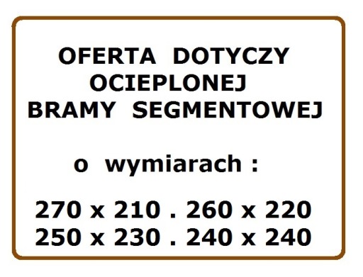 - W podanej kwocie zakupu jest - kompletna brama segmentowa w wybranym wymiarze i kolorze o wysokości nadproża minimum 35 cm .