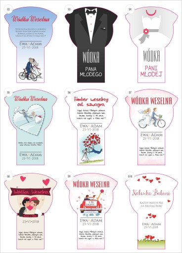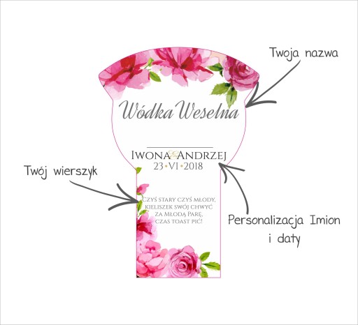 Dane na naklejkach mogą być dowolne (dowolny wiersz, dedykacja, imiona, nazwa trunku itp.)