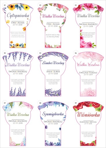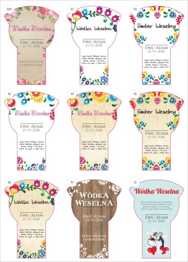 Eleganckie, oryginalne naklejki na alkohol weselny. Wiele ciekawych, niepowtarzalnych wzorów.