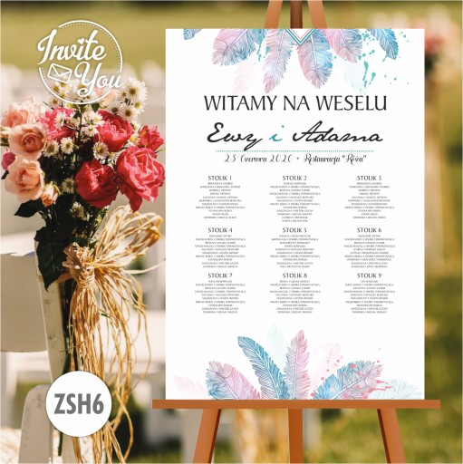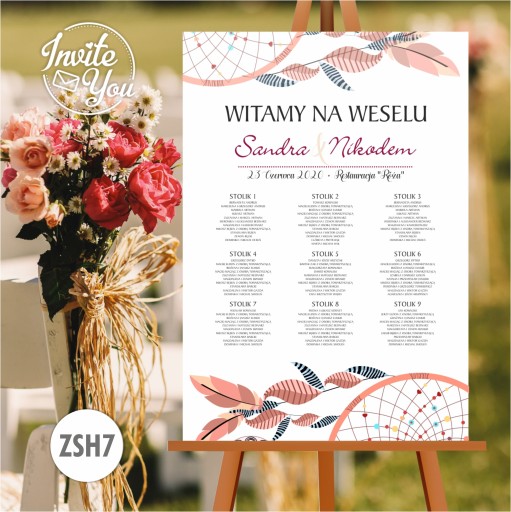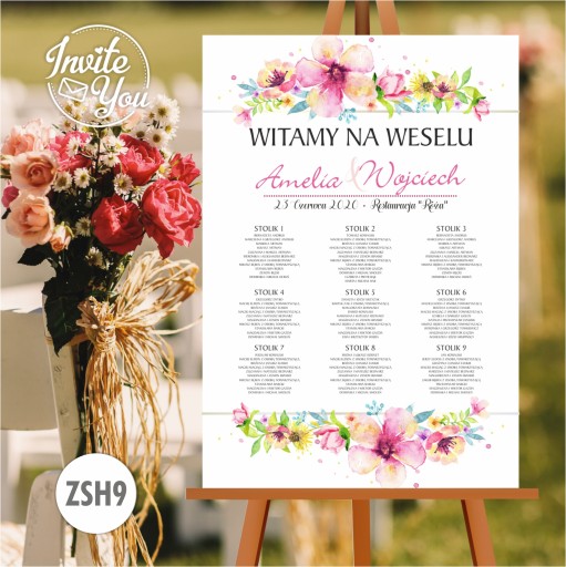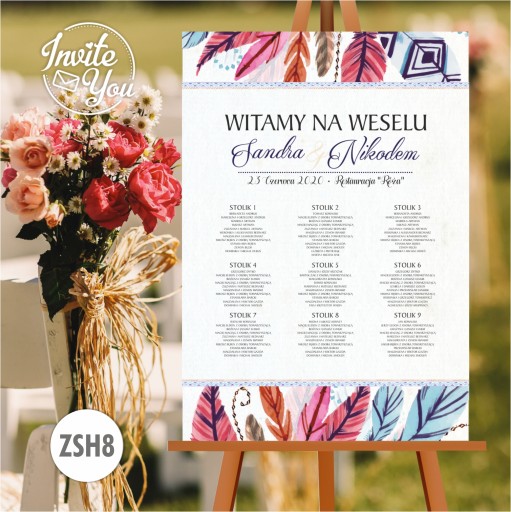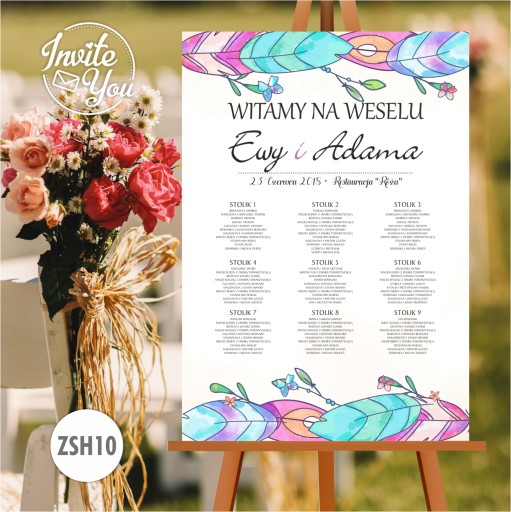 Eleganckie, kolorowe plansze z listą gości. Na planszy znajduje się rozpiska gości wraz z przypisanymi stolikami. Plansza z listą gości może być ustawiona przy wejściu do sali ułatwiając jednocześnie gościom odnalezienie swojego miejsca na sali.