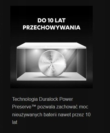 Specjalistyczne litowe baterie pastylkowe Duracell 2032 wykonane są z litu o wysokim stopniu czystości i mają nawet do 50% większą moc (w porównaniu z minimalną średnią żywotnością litowych baterii pastylkowych CR2032 wg standardowego testu Key Fob IEC; wyniki mogą się różnić w zależności od urządzenia i sposobu użytkowania). Przeznaczone są do zasilania specjalistycznych urządzeń. Technologia Duralock umożliwia ich przechowywanie nawet przez dziesięć lat, dzięki czemu możesz sięgnąć po swój zapas litowych baterii pastylkowych zawsze, gdy są Ci potrzebne.