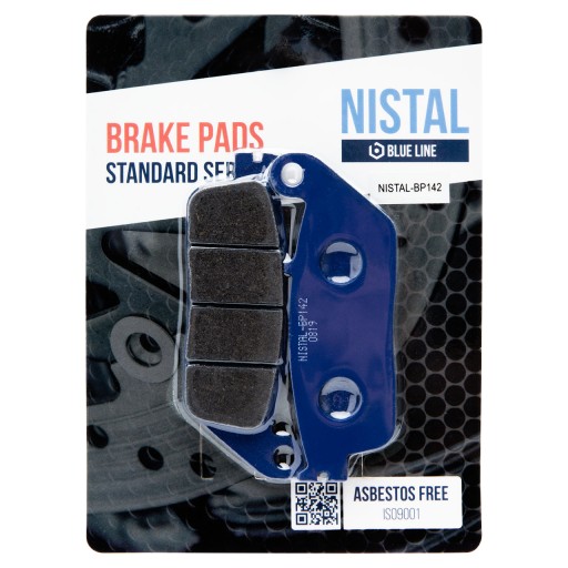Klocki hamulcowe marki NISTAL to bezpieczny i trwały produkt posiadający doskonały stosunek jakości do ceny. Okładzina to organiczny materiał cierny wzbogacony dodatkami poprawiającymi hamowanie. Klocki z niebieskiej serii BLUE LINE dzięki zawartości 20% miedzi, zapewniają dobre odprowadzanie ciepła, nie szarpią i nie piszczą podczas hamowania. Zapewniają łagodne zużywanie się tarczy. Sprawdzą się również w cięższych motocyklach do rekreacyjnej jazdy. Wytwarzane zgodnie z certyfikatami: ISO 9001:2008, ISO 14001:2004, OHSAS 18001:2007.