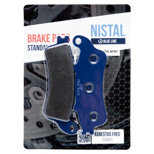 Klocki hamulcowe marki NISTAL to bezpieczny i trwały produkt posiadający doskonały stosunek jakości do ceny. Okładzina to organiczny materiał cierny wzbogacony dodatkami poprawiającymi hamowanie. Klocki z niebieskiej serii BLUE LINE dzięki zawartości 20% miedzi, zapewniają dobre odprowadzanie ciepła, nie szarpią i nie piszczą podczas hamowania. Zapewniają łagodne zużywanie się tarczy. Sprawdzą się również w cięższych motocyklach do rekreacyjnej jazdy. Wytwarzane zgodnie z certyfikatami: ISO 9001:2008, ISO 14001:2004, OHSAS 18001:2007.