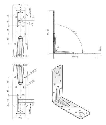 Kątownik z przetłoczeniem 128,5x128,5x45x2.5