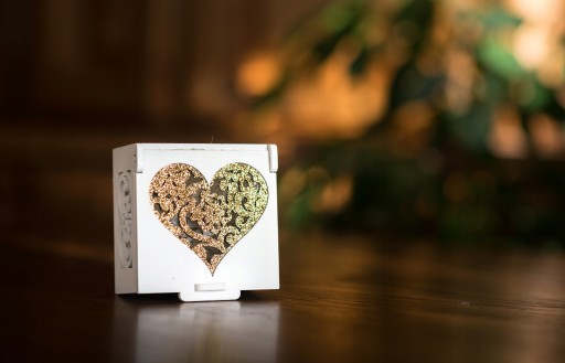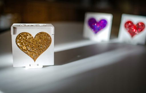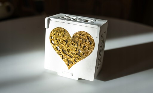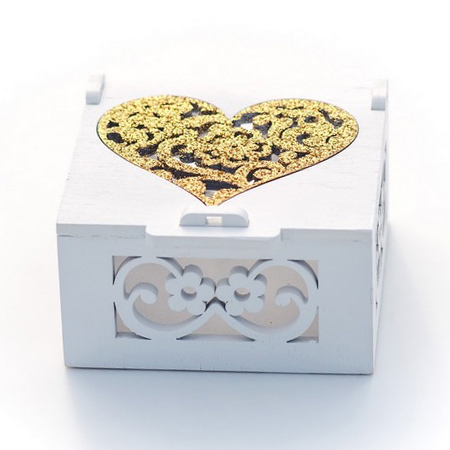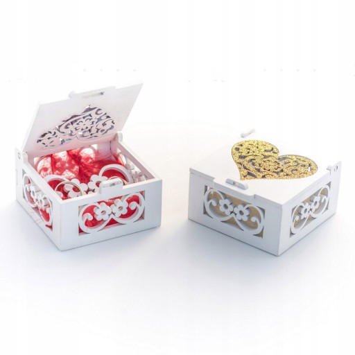 Białe pudełko z wkomponowanymi złotymi brokatowymi elementami w kształcie serca.