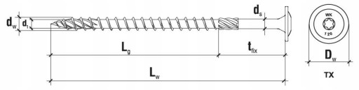 Wkręty konstrukcyjne wykonane ze stali ocynkowanej posiadają łeb podkładkowy z gniazdem typu TX oraz specjalną końcówkę wiercącą przeznaczoną do połączeń w konstrukcjach drewnianych.