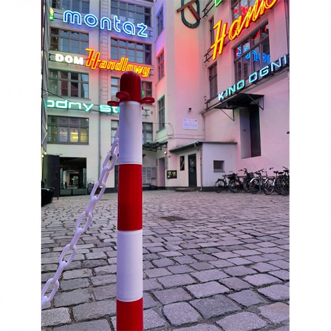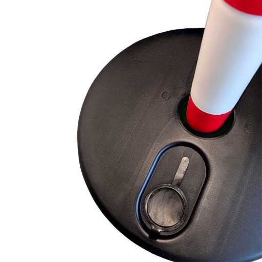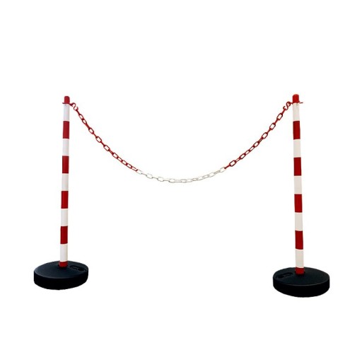 Słupki odgradzające są wykonane z trwałego tworzywa sztucznego. Posiadają okrągłą podstawę, którą należy wypełnić piaskiem lub wodą. Umożliwiają stałe i tymczasowe wygrodzenia terenu, a biało-czerwona kolorystyka zapewnia dobrą widoczność.