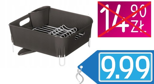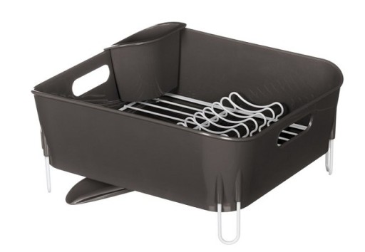 Ergonomiczna suszarka do naczyń z podstawowym wyposażeniem oraz dodatkowym miejscem na sztućce. Kolor szaro-biały.
