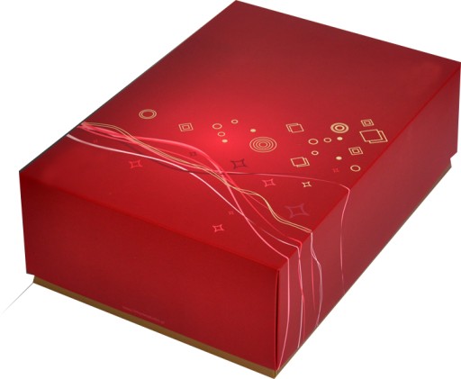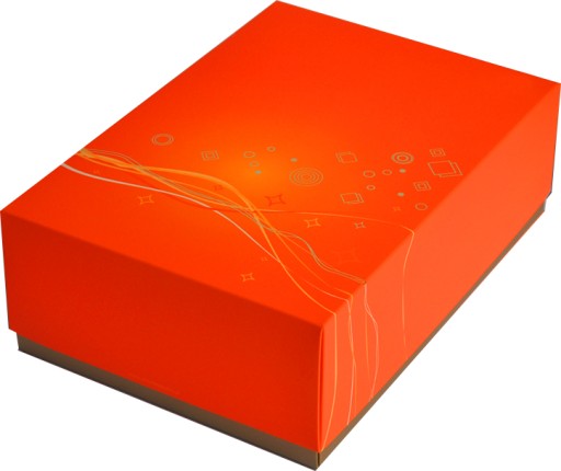 Pudełko prezentowe wykonane z białego, grubego kartonu, wierzch w kolorze mocnego pomarańczu, z dekoracjami wykonanymi złotą folią. Spód pudełka w kolorze złotym.