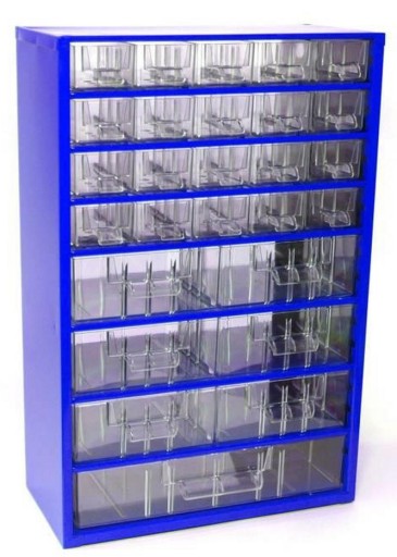 - OBUDOWA METALOWA, SZUFLADKI Z POLISTYRENU, ZESTAW POSIADA 20 MAŁYCH SZUFLADEK, 6 ŚREDNIE, 1 DUŻĄ