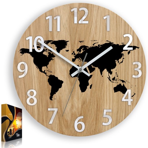 Zegar ścienny Dębowy WORLD z motywem mapy świata - jest masywny i mocny, wykonany z dbałością o każdy szczegół. Posiada czytelną tarczę z wyraźnymi białymi cyframi. Zegar swoim wyglądem nawiązuje do stylu skandynawskiego - wnętrza naturalne i jasne. Został został wyposażony w Ultra Cichy mechanizm. Zegar został także zapakowany w eleganckie pudełko idealnie nadające się na prezent.