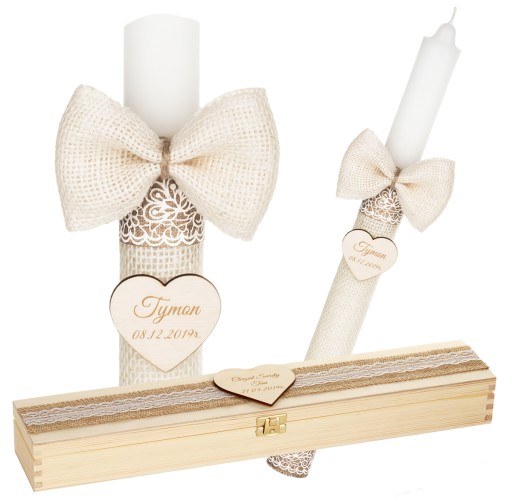 - rękodzieło - świeca jest owinięta grubym, jutowym sznurkiem, klejonym punktowo w sposób niewidoczny do świecy. Kokarda jutowa ze sztywnego materiału jest przytwierdzona na trwałe do świecy, sklejona i przywiązana jutowym sznurkiem. Mniejsza kokardka lub kwiatek jest na trwałe przyklejona.