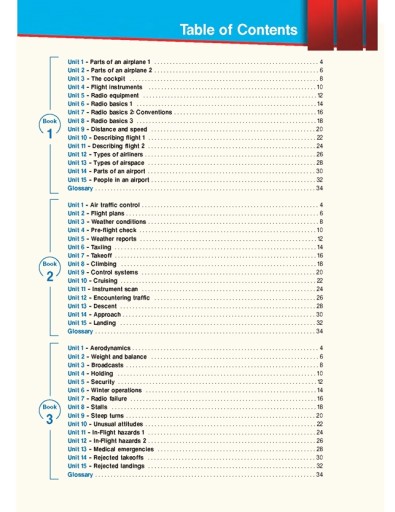 Książka ucznia (Student's Book) składa się z trzech części (Books 1-3). W skład poszczególnych części wchodzi 15 rozdziałów. Każdy rozdział poświęcony jest innemu zagadnieniu tematycznemu i zawiera osadzone w realistycznym kontekście teksty pozwalające na poznawanie specjalistycznego słownictwa. Obejmuje także różnorodne ćwiczenia umożliwiające zintegrowane rozwijanie czterech sprawności językowych: czytania, słuchania, mówienia i pisania. Po każdej z trzech części znajduje się słowniczek angielsko-angielski zawierający łącznie ponad 400 haseł i zwrotów. Przykładowe tematy to: budowa samolotu, komunikacja z pasażerami i kontrolerem lotu, charakterystyka lotu samolotem (np. prędkość, wysokość, podstawowe manewry), lotnisko i obsługa naziemna, wieża kontroli lotów, warunki atmosferyczne, procedury bezpieczeństwa.