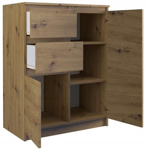 Wnętrze komody składa się z półek oraz dwóch szuflad, które pomogą przy rozmieszczaniu rzeczy. Łatwiej będzie znaleźć to, czego się szuka.