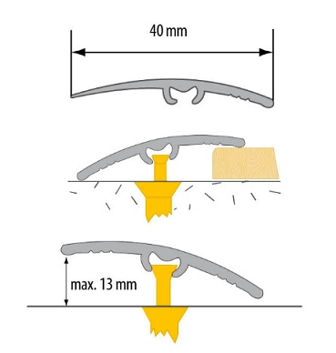 Listwy progowe o długości 180 cm i szerokości 40 mm, wykonane z PCV. Umożliwiają łączenie różnych nawierzchni podłogowych, np. paneli z panelem, paneli z wykładziną, paneli z glazurą, itp. Niwelują różnicę poziomów do 13 mm. Sposób mocowania jest niewidoczny. Powierzchnia pokryta trwałym laminatem, w dużym stopniu odpornym na ścieranie.
