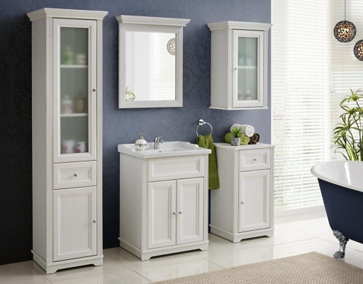 - Klasyczny zestaw mebli łazienkowych w odcieniu malowanej na biało sosny.