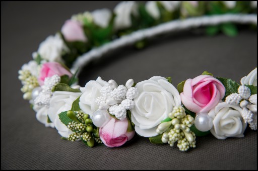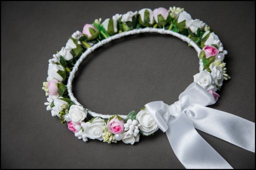 - Przedmiotem oferty jest piękny wianek komunijny wykonany ręcznie z kwiatów piankowych oraz dodatków florystycznych.